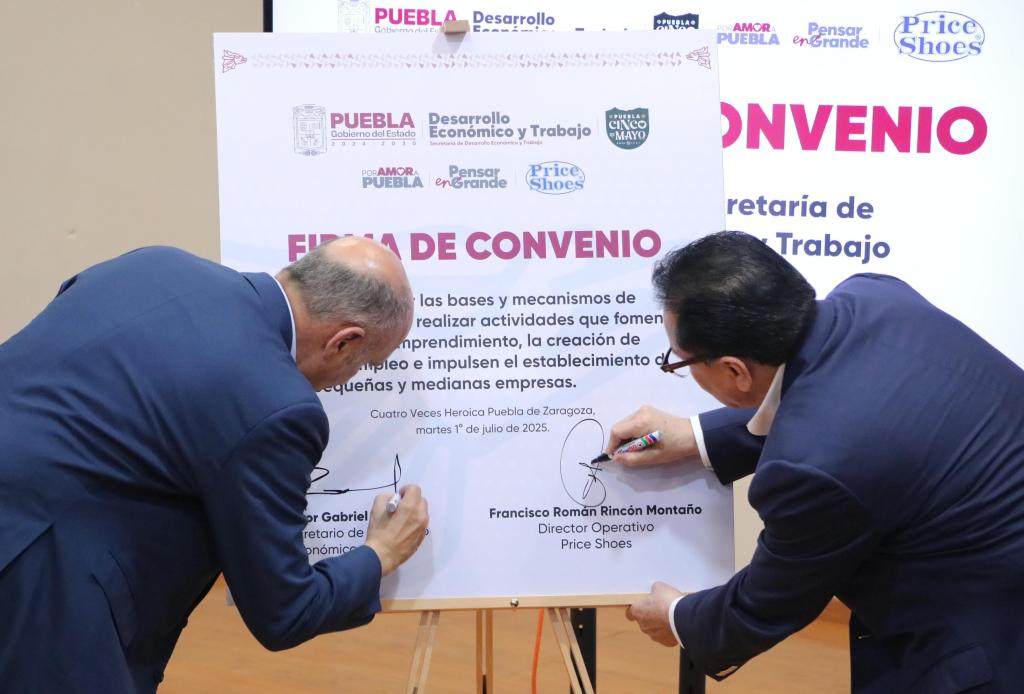 Rincón Montaño reconoció la apertura y la certeza que les ha brindado el Gobierno del Estado de Puebla para crecer como empresa en la entidad e impulsar el crecimiento económico y social de sus colaboradoras y colaboradores. En esta firma de convenio estuvieron presentes también el director de Tiendas Comunidad de Price Shoes, Omar Verduzco Dueñas; el subdirector operativo de Price Shoes, Pedro Octavio Vera Hernández; la subsecretaria de Fomento Empresarial, Dafne Gaspar Santamaría; y la subsecretaria de Industria y Comercio, Mónica Barrientos Sánchez.