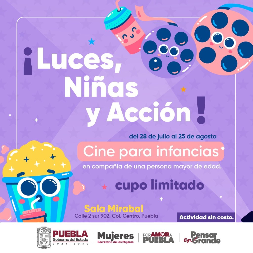 Con el objetivo de promover espacios culturales y recreativos que fortalezcan las redes de cuidado y promuevan la reconstrucción del tejido social, el Gobierno del Estado de Puebla, a través de la Secretaría de las Mujeres, invita a las infancias a disfrutar del ciclo de cine “¡Luces, niñas y acción!”.
